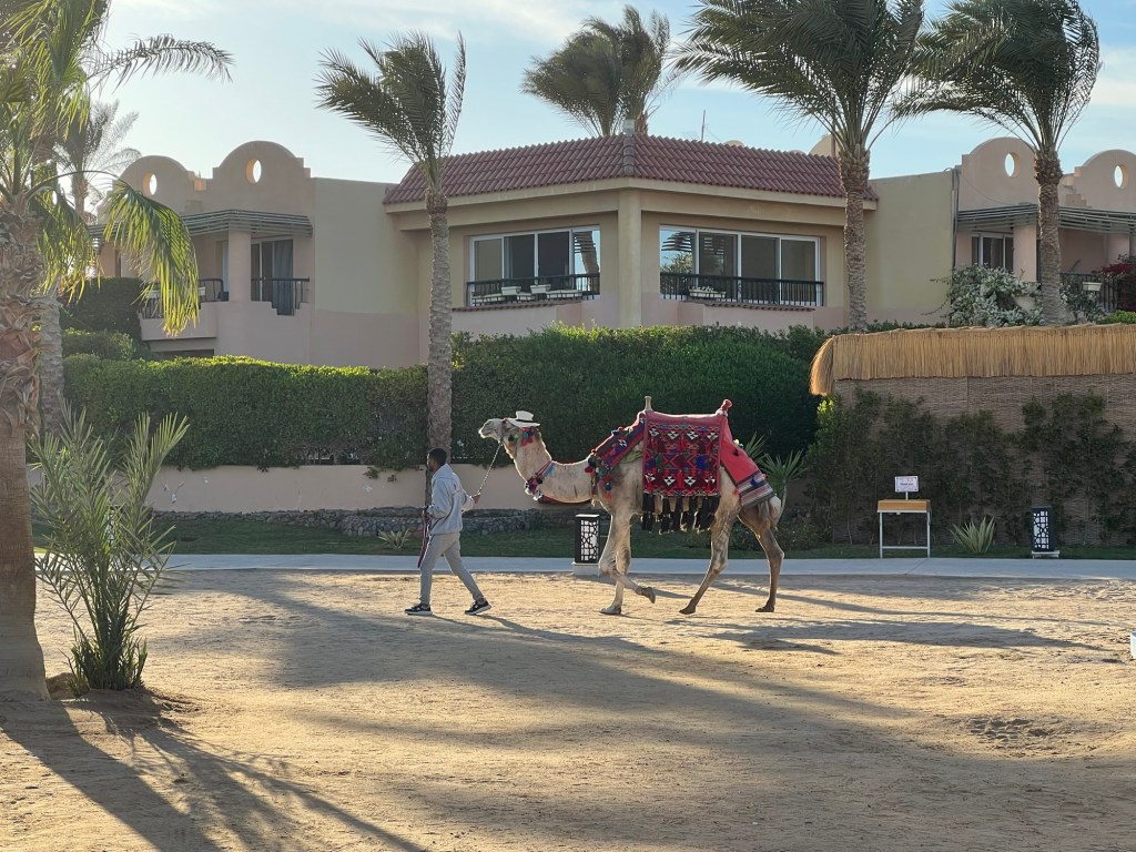 Auf dem Rückweg zu unserem Zimmer sehen wir noch ein Kamel mit bayerisch oder tirolerisch anmutendem Strohhut.