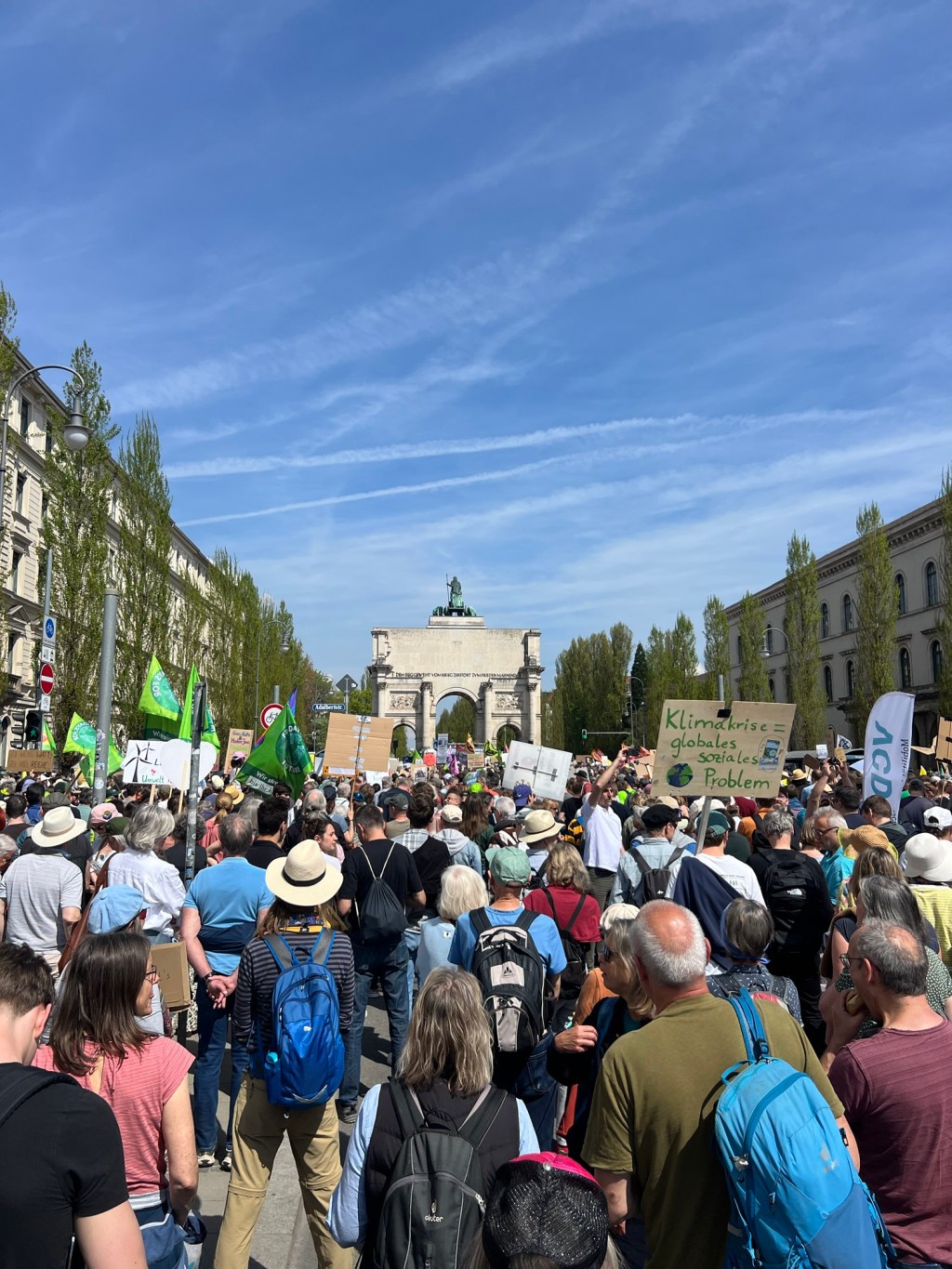 Plötzlich zeigt google Maps an es seien nur noch 500 m bis zur Leopoldstraße und noch sehen wir keine Stadt. Keine Häuser. Keine Straßen. Es ist unglaublich. Nur Grün. Dann kommt ein Kiosk mit Bierbänken draußen im Grünen und dann eine Straße. Die Zivilisation hat uns wieder. Viele Menschen drängen sich auf engstem Raume. Autos, Fahrräder, Spaziergänger. Wir wursteln uns die letzten 300 Meter durch und stehen plötzlich inmitten der Demo direkt auf der Leopoldstraße. Mit Blick auf das Siegestor.. Schnell schließen wir unsere Fahrräder ab und schauen einmal was auf der Kundgebung so passiert