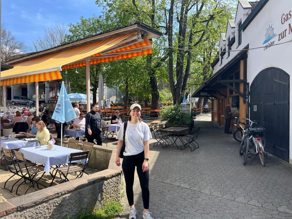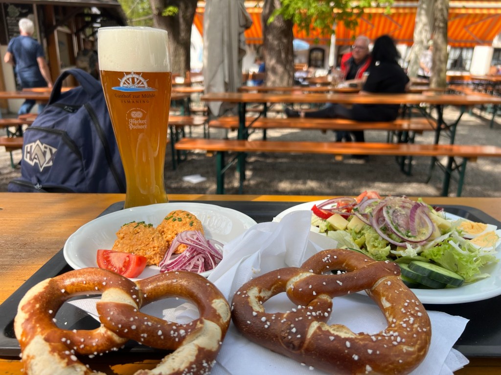 Wir genießen so richtig die schöne Biergarten Atmosphäre und die Brezen, das Essen und die kühlen Getränke.
